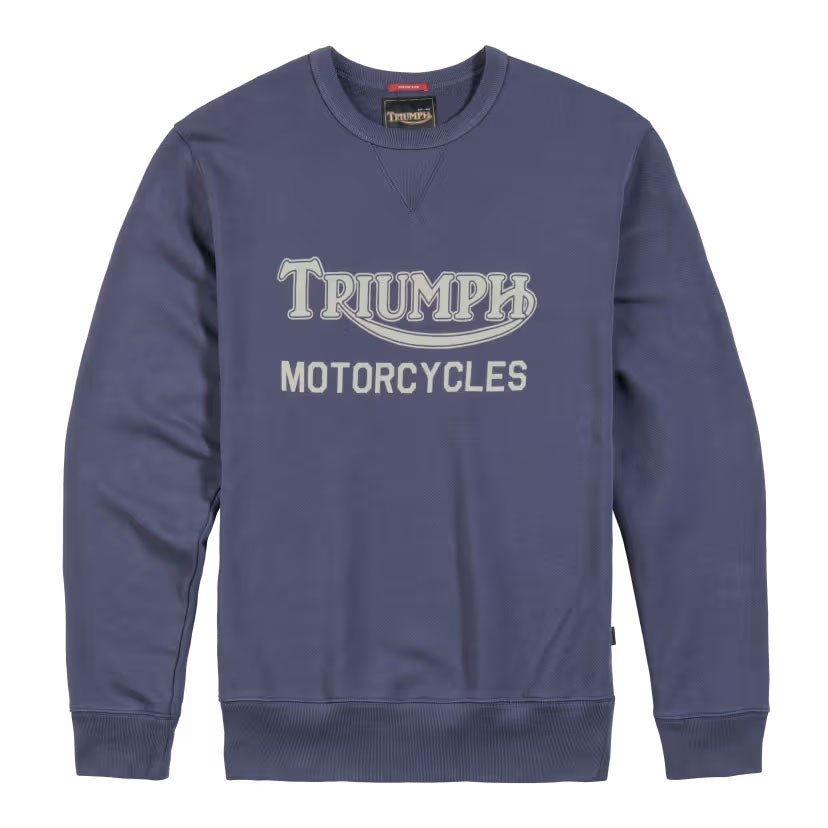 Pitkähihainen collegepaita Triumph logopainatuksella. Tämä on juurikin sellainen paita, jota voi huoletta käyttää melkein missä tahansa arjen tapahtumassa ja samalla näyttää hyvältä. Klassinen tummansininen V-tikattu pyöreä kaulus, kullanvärinen Triumph heritage logo edessä ja ommeltu Union Jack helmassa. Tyylikästä!